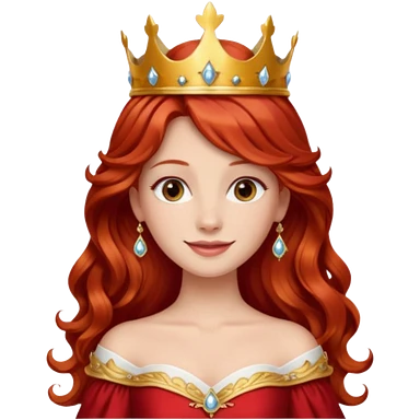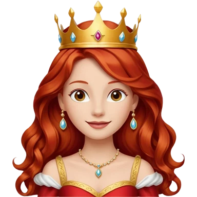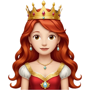 Red Haired Princess, Elegant Princess – long wavy red hair, gold crown, red-white gown, calm smile. emoji