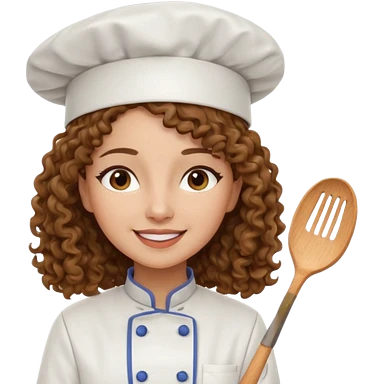 Long curly hair, happy, wearing chef uniform and chef hat emoji