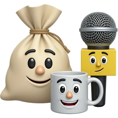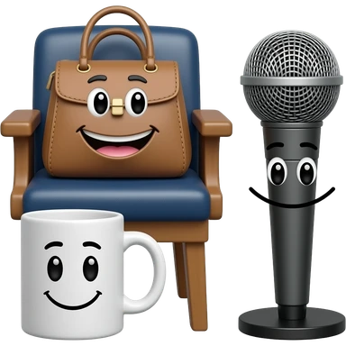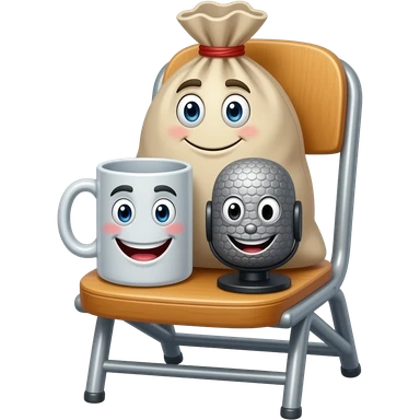 bag with face and mug with face and microphone with face setting in court chair emoji