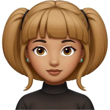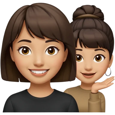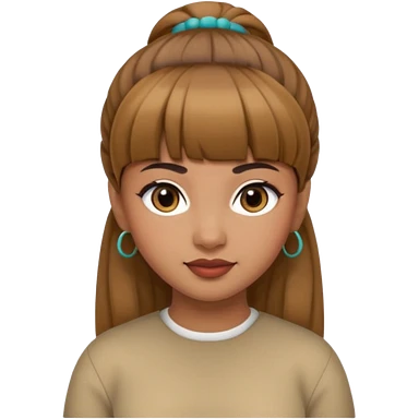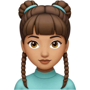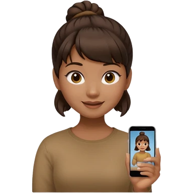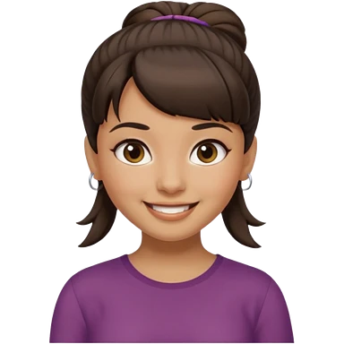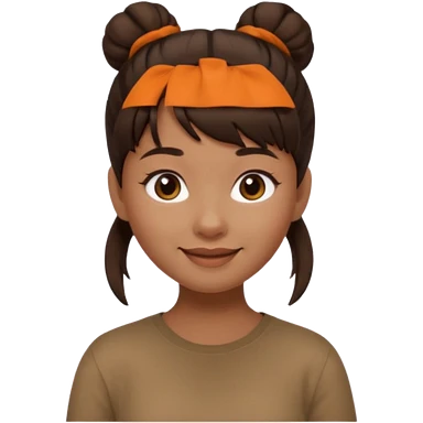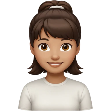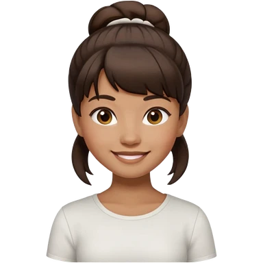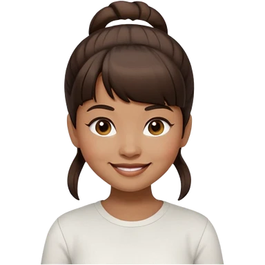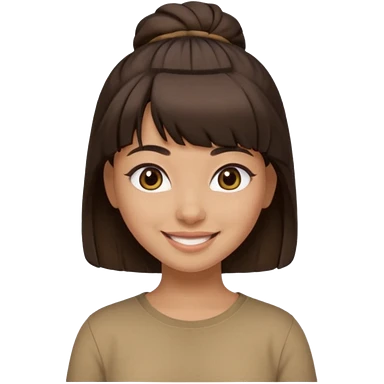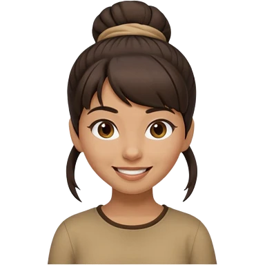 In Apple Memoji format, a girl with dark brown hair. She has bangs and her hair is in a singular high bun. The girl is arab and has light brown skin. She is wearing a brown shirt. She is smiling but is not showing her teeth. emoji