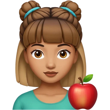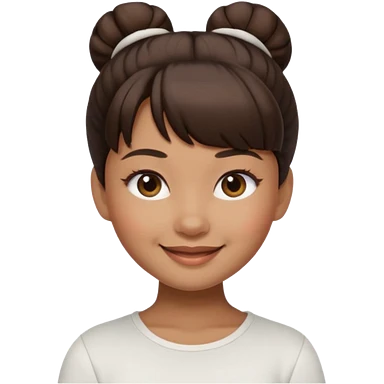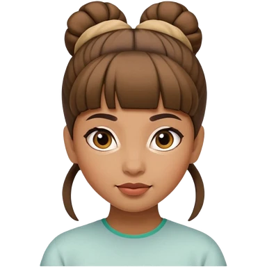 In Apple Memoji format, a girl with dark brown hair. She has bangs and her hair is in a singular high bun. The girl is arab and has light brown skin. She is wearing a white shirt emoji
