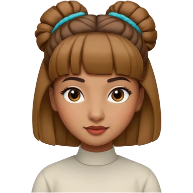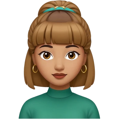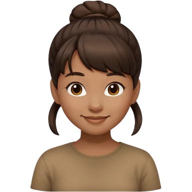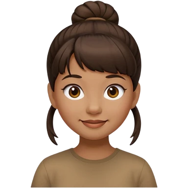 In Apple Memoji format, a girl with dark brown hair. She has bangs and her hair is in a singular high bun. The girl is arab and has light brown skin. She is wearing a brown shirt. She is soft smiling, no teeth shown. emoji