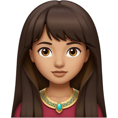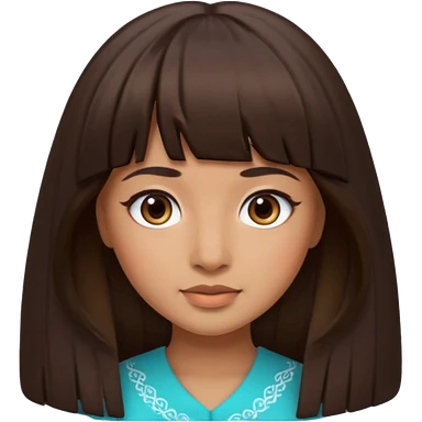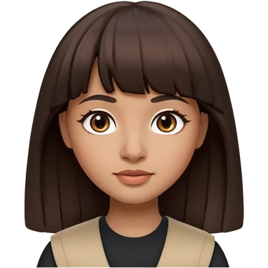 In Apple Memoji format, a girl with dark brown hair. She has bangs and her hair is long. The girl has light brown skin and arab ethnic features emoji