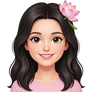 Create an emoji of a girl with beautiful, long, stylish black hairs. Her skin complexion is fair, a pink lotus secured in her hair. She smiles gently. emoji