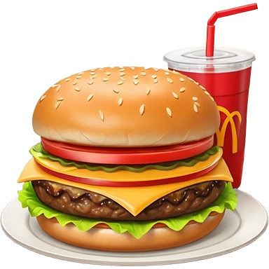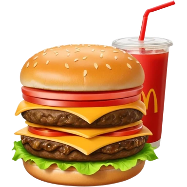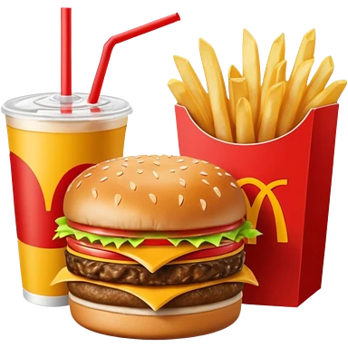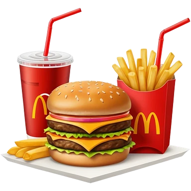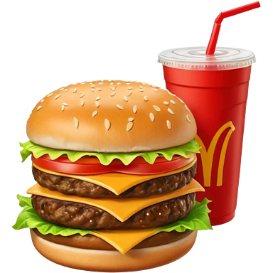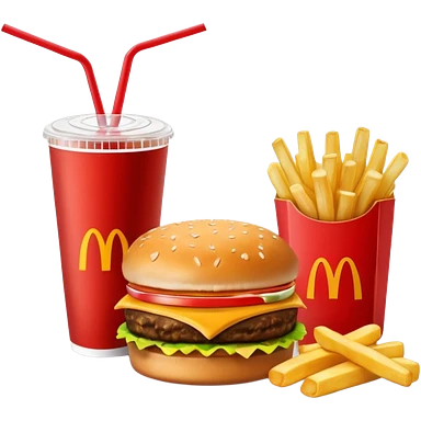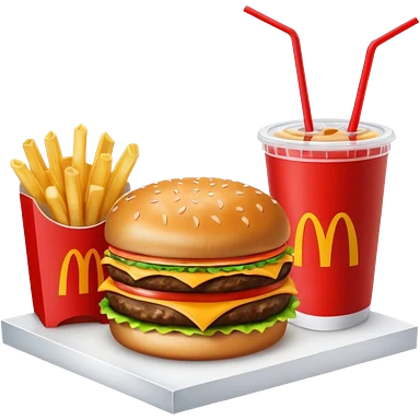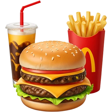 make a Luxe Cheeseburger Meal combo with cold drink inside that a straw and some ice cubes and beside some McDonald's fries box inside some thick fries with a angle to 15–20° gentle bird’s-eye angle emoji