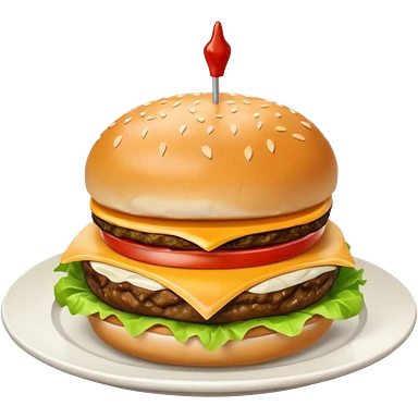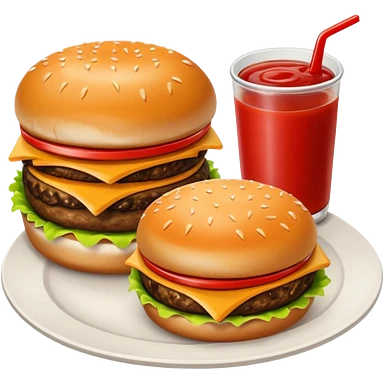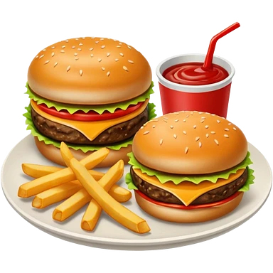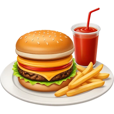 i want a Cheeseburger and Fries with a angle to 15–20° gentle bird’s-eye angle with 2 sauce round plate one is white and other is red with some fries thicker like mcdonald's emoji