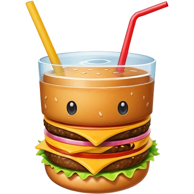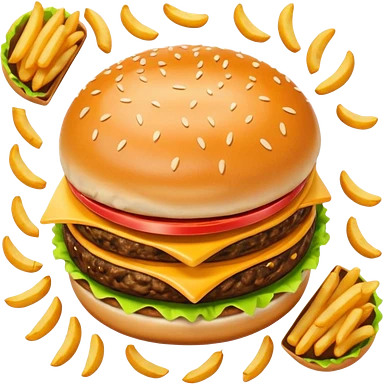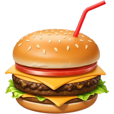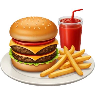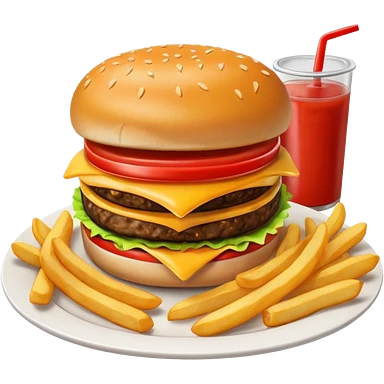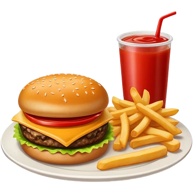 i want a Cheeseburger and Fries with a angle to 15–20° gentle bird’s-eye angle with a cold drink with ice cube with straw with some fries thicker like McDonald's french fries emoji