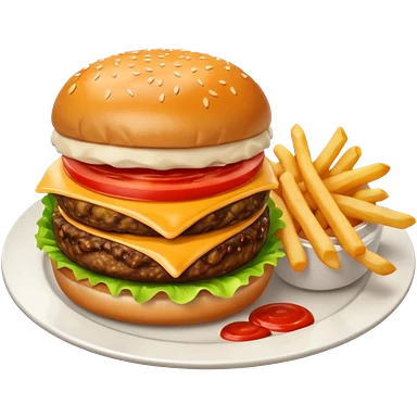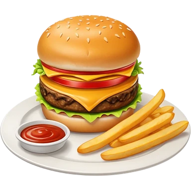 i want a Cheeseburger and Fries with a angle to 15–20° gentle bird’s-eye angle with Sause on white plate emoji