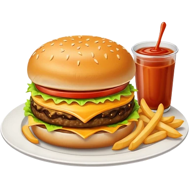 i want a Cheeseburger and Fries with a angle to 15–20° gentle bird’s-eye angle with 2white and red Sause on white plate emoji