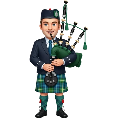 A male scottish bagpipes with green & blue tartan and a smile emoji