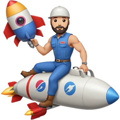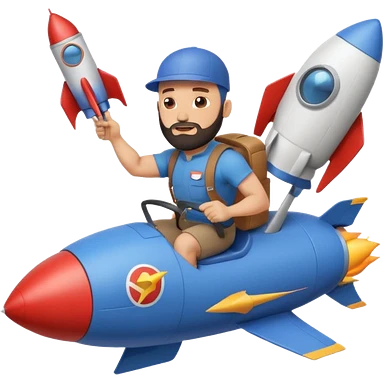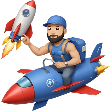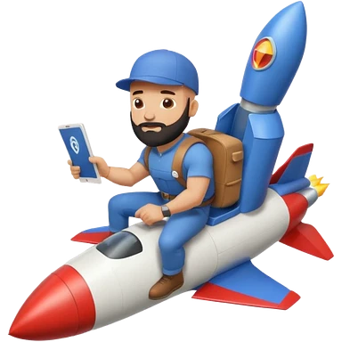 Bald muscular guy with beard and backwards cap, riding rocket, holding Instagram logo, papers trailing behind, minimal style emoji