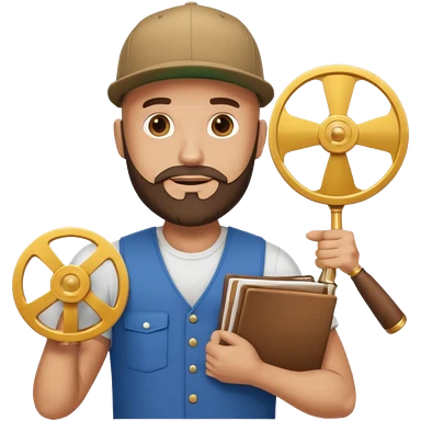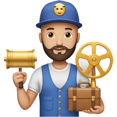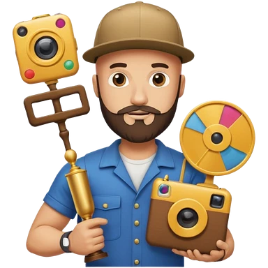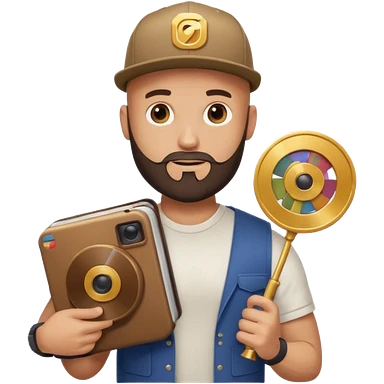 Strong bald man with beard and snapback, giant Instagram reel icon, stack of golden documents, trophy, minimal emoji emoji