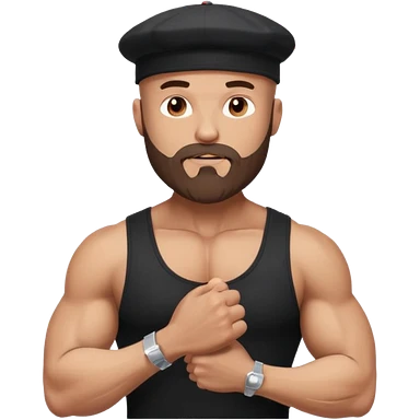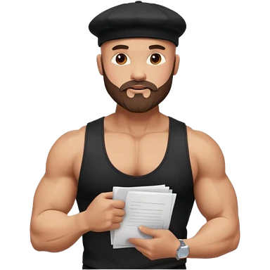 Buff bald bearded guy in black cap flexing, Instagram icon on chest, papers flying around, sparkles, minimal style emoji