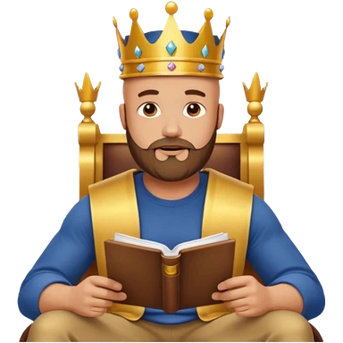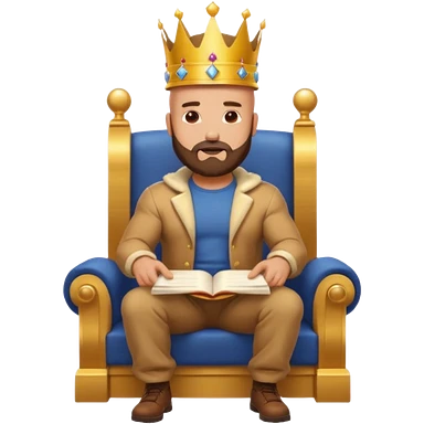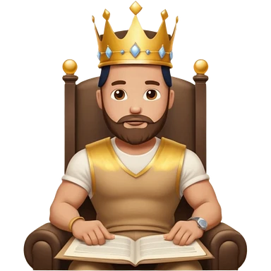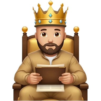 Buff bald bearded man wearing crown and cap, sitting on throne of documents, Instagram icon floating, golden glow, minimal emoji emoji
