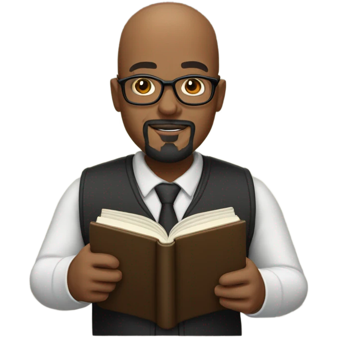 Bald head black professor with a goatee and glasses holding a book giving oratory. emoji | AI Emoji Generator