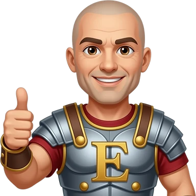 Muscular Roman soldier bald brown eyes smiling giving thumbs up letter E on breast plate emoji