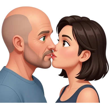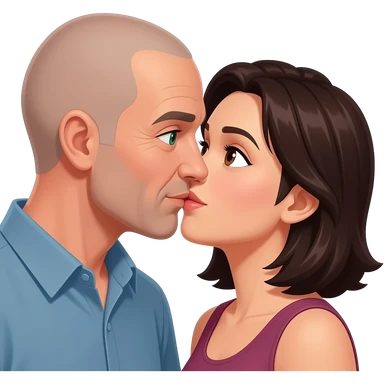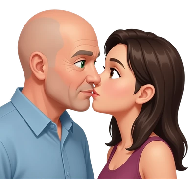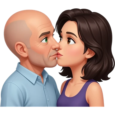 Middle age, bald man with salt and brown, scruff, green eyes, kissing a dark haired woman with brown eyes emoji