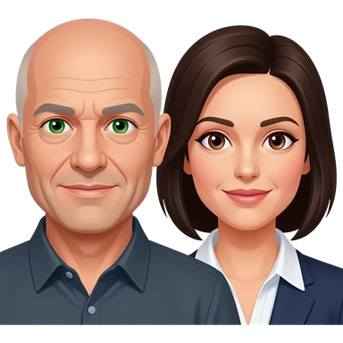 Middle age, bald man with green eyes and dark haired woman with brown eyes emoji