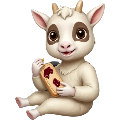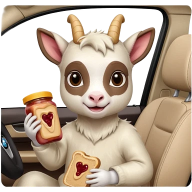 cute baby goat eating peanut butter and jelly driving in a bmw x1, holding a peanut butter and jelly in hand emoji