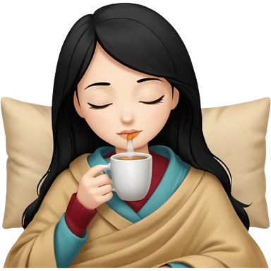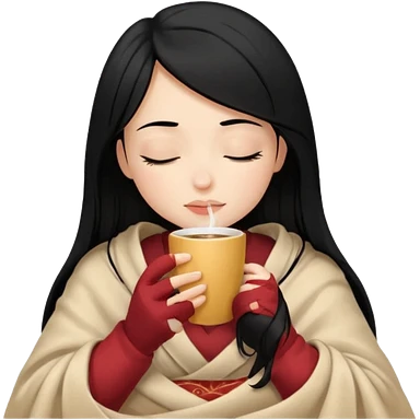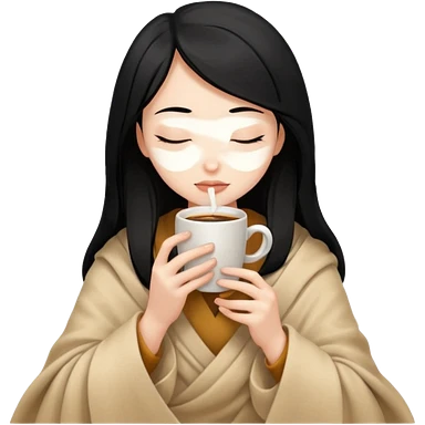 black hair girl long hair inside a beige blanket sipping coffee eyes closed emoji
