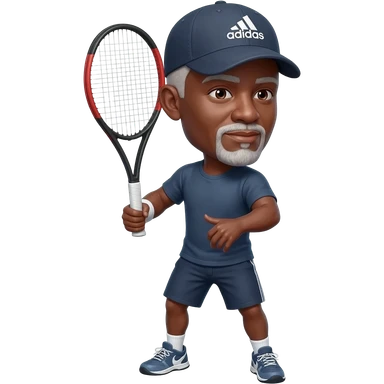Right handed adult black male Tennis player bald male white short beard and mustache one demonstrating handed backhand wearing an adidas baseball cap on backwards emoji