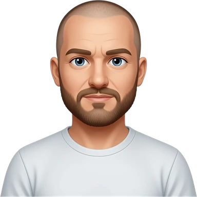 bald white man with very light stubble on head. beard is brown with some great. wearing a solid t shirt. emoji