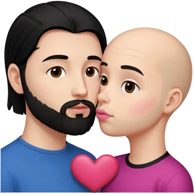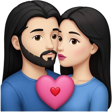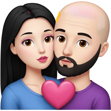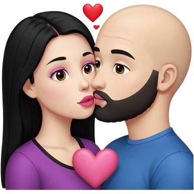 👩🏻❤️💋👨🏻 this one but the man should be bald. white woman with long black hair and white bald young man whoitiut hair and a heart between their heads. she has pink lips and both have brown eyes. he has e full beard but short. both wear black emoji