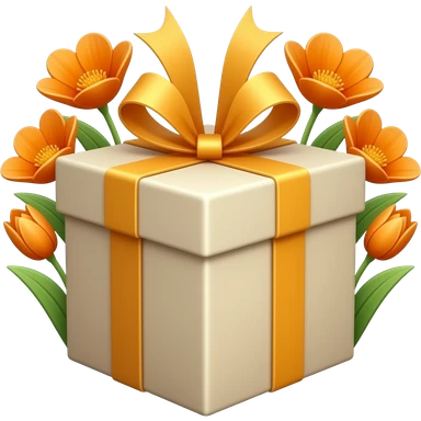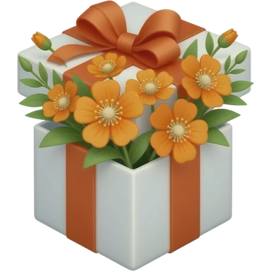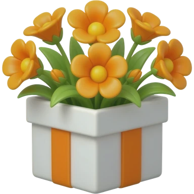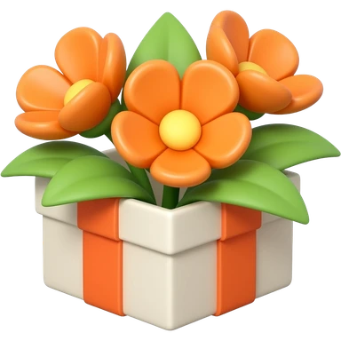square gift box, no lid, spring orange flowers with green leaves protruding, flat style, soft shapes, emoji-like emoji