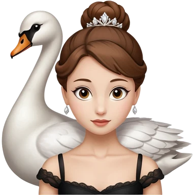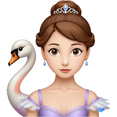 Beautiful lady with fair skin, brown hair, and large hazel eyes. She is wearing a low ballet bun and wearing the ballet costume of The Swan Queen emoji