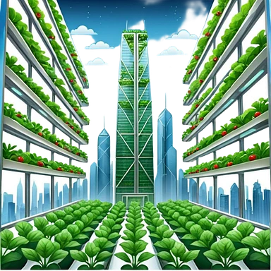 Vertical farm inside a towering skyscraper, with various crops growing in a hydroponic system under LED lights, viewed through a large window overlooking a futuristic city. emoji