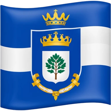 Bandera de Galicia: Emoji de bandera 2:3. Fondo blanco con franja diagonal azul celeste (de arriba izquierda a abajo derecha). En el centro, escudo azul con cáliz dorado y hostia blanca, siete cruces blancas alrededor y corona real dorada y roja encima. Estilo plano tipo emoji, colores sólidos. emoji