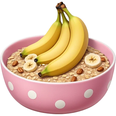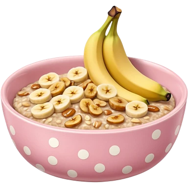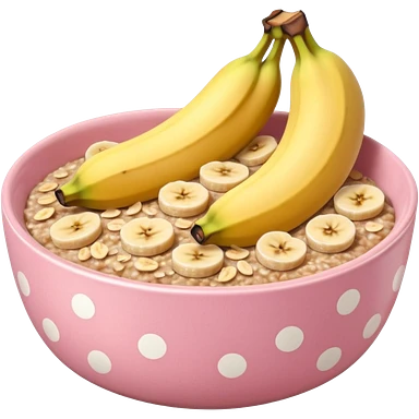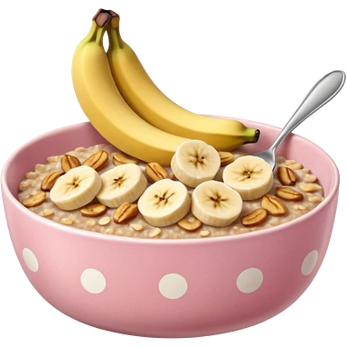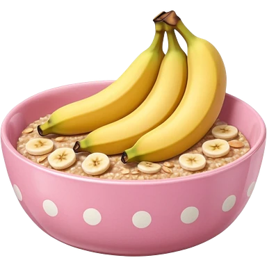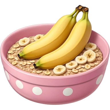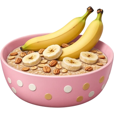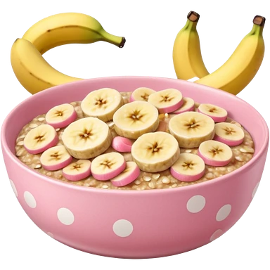 banana baked oats in a bowl like oat meal with a couple banana slices on top that look a little bit caramelised and a light pink bowl with white polka dots please with NO whole banana on top just slices emoji
