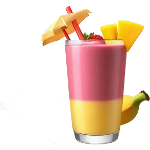 A strawberry banana smoothie with a (orange colored straw in a plastic cup) emoji