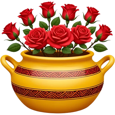 Yellow ceramic pot with red roses; the pot is decorated in an ethnic style. emoji