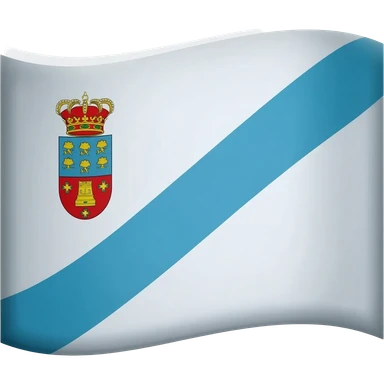 Bandera de Galicia: Emoji de bandera 2:3. Fondo blanco con franja diagonal azul celeste (de arriba izquierda a abajo derecha). En el centro, escudo azul con cáliz dorado y hostia blanca, siete cruces blancas alrededor y corona real dorada y roja encima. Estilo plano tipo emoji, colores sólidos. emoji