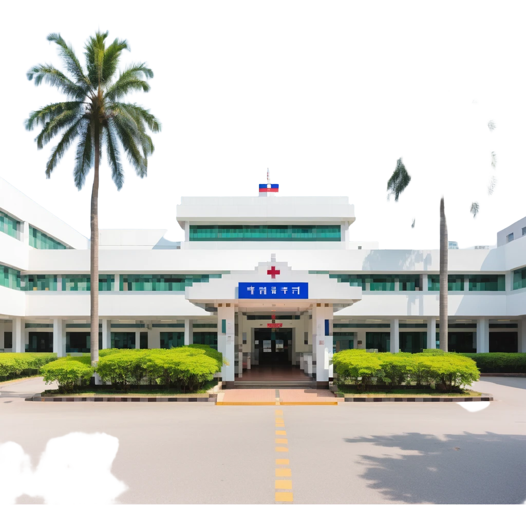 Bangkok hospital with tropical palm trees and Thai style entrance emoji