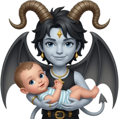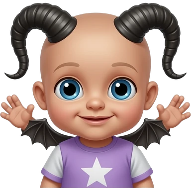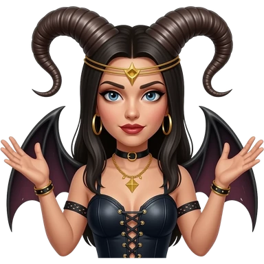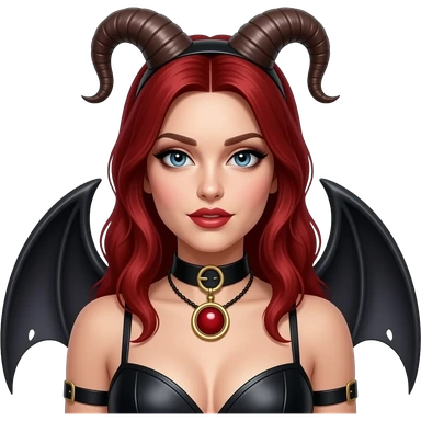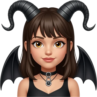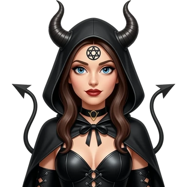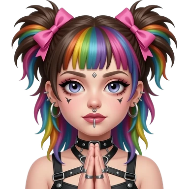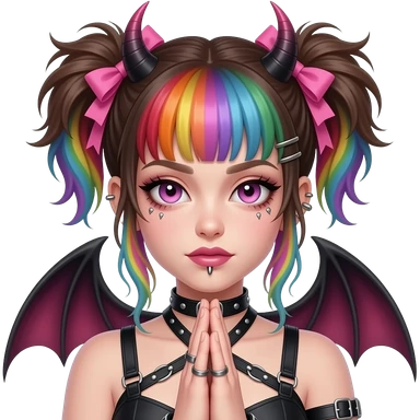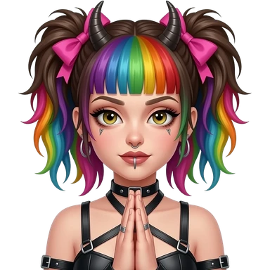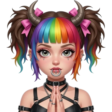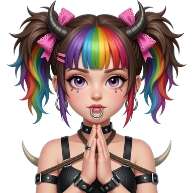 Baphomet babe with messy, washed-out rainbow dyed hair and overgrown brunette roots, styled into two matted, spiky, y2k/alt-fashion buns, styled with frilly girly pink hair bows and bondage restraints while saying a prayer to her dear lord and daddy Lucifer down below emoji | AI Emoji Generator