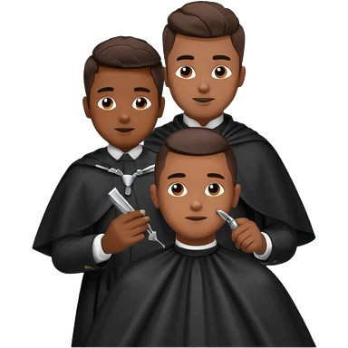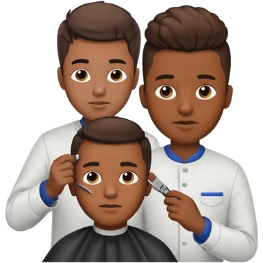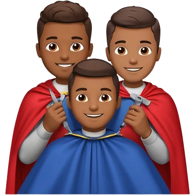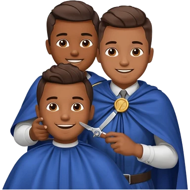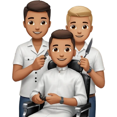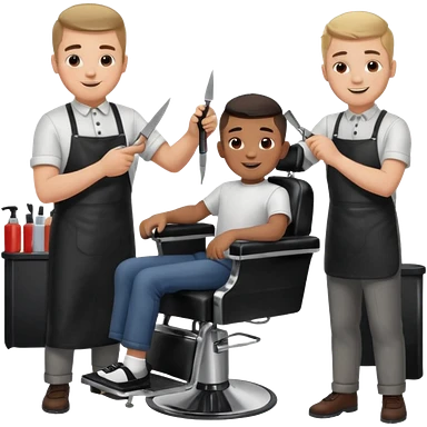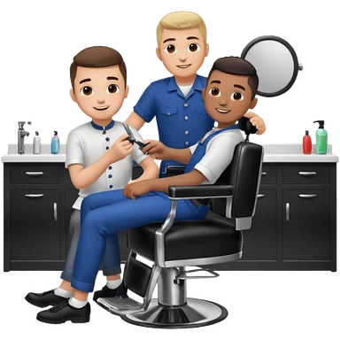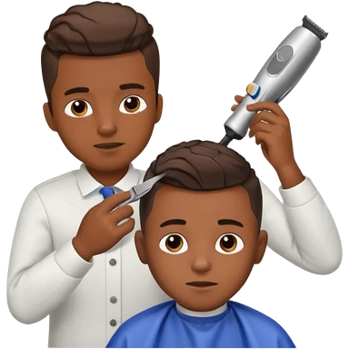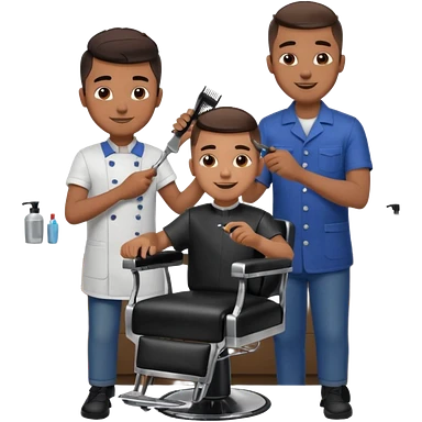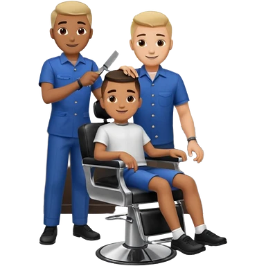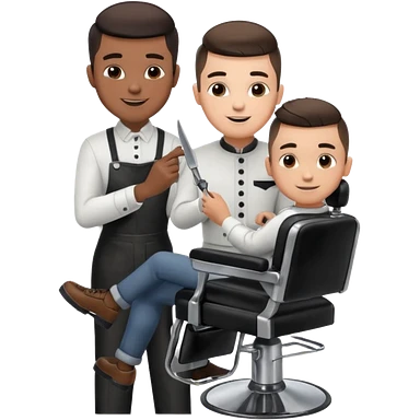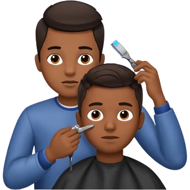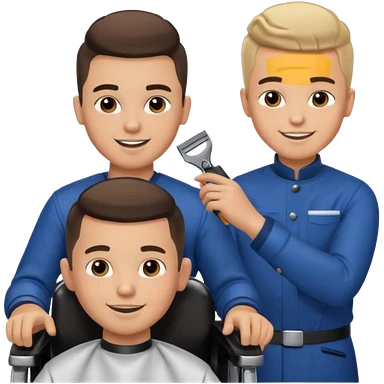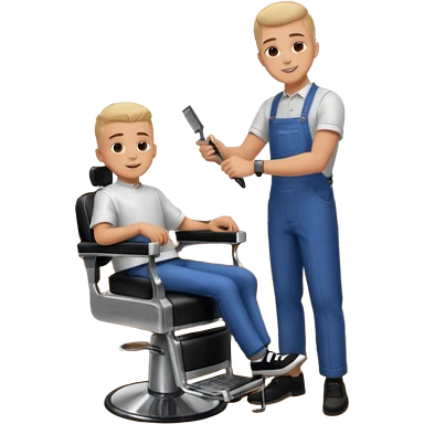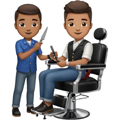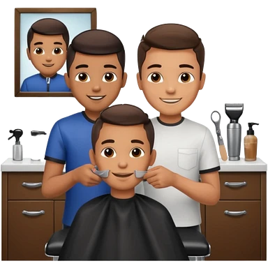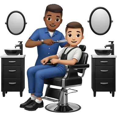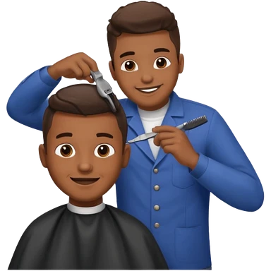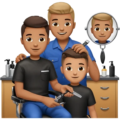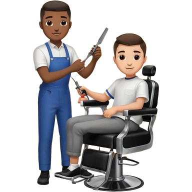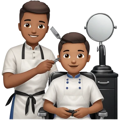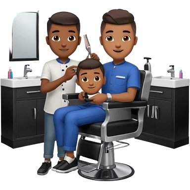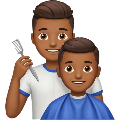Barber cutting teenage boys hair. Show the boy sat in black barber chair and both having smiles on their faces emoji | AI Emoji Generator