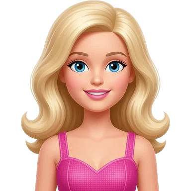 Barbie from Barbie and Friends with blue eyes, long blonde high ponytail hair, pink eyeshadow, pink lipstick, pink metallic halter dress, pink earrings emoji