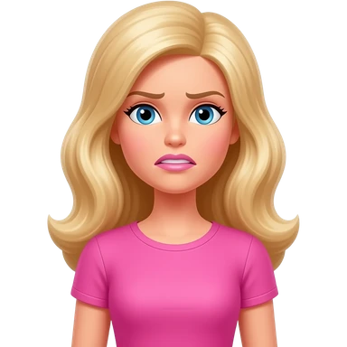 barbie character wearign a pink shirt with sleeves with a fustrated expression emoji