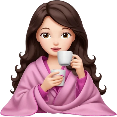 Barbie girl with a long wavy dark brown hair inside a pale pink blanket sipping coffee eyes closed emoji