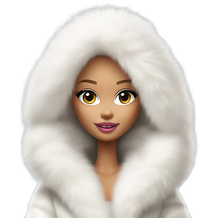 Barbie looking emoji in an extremely big fluffy oversized white fur coat with hood on. The fur is real and it’s very obvious big and fluffy like in Pinterest emoji | AI Emoji Generator