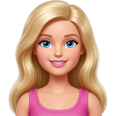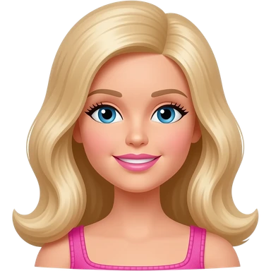Barbie from Barbie and Friends with blue eyes, long blonde high ponytail hair, pink eyeshadow, pink lipstick, pink metallic halter dress, pink earrings emoji