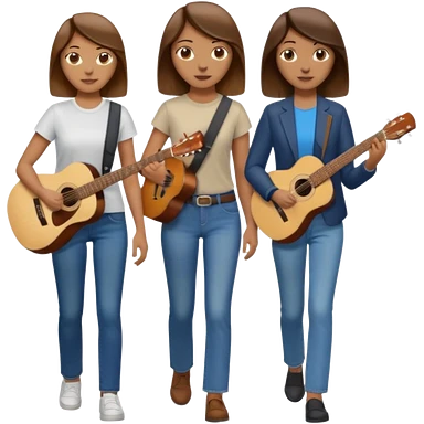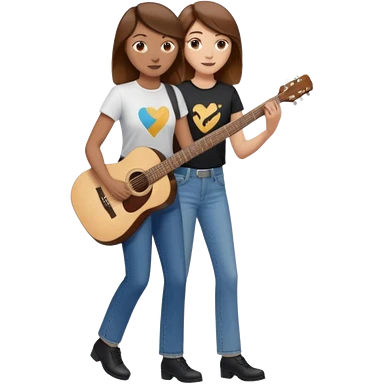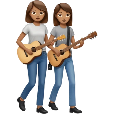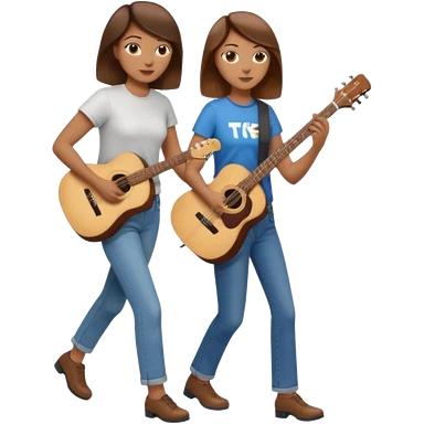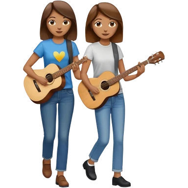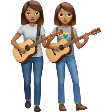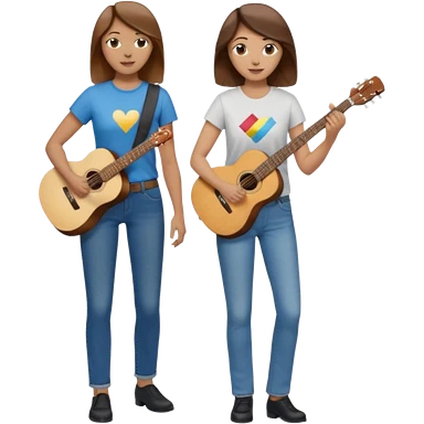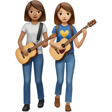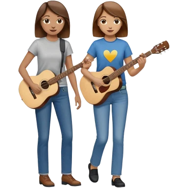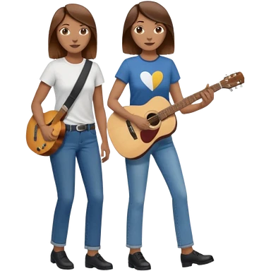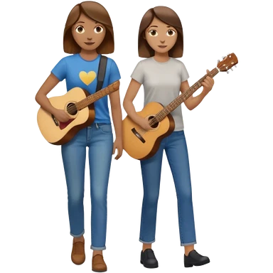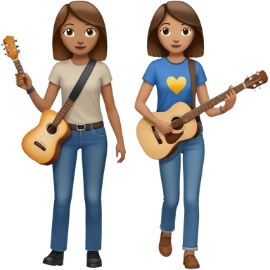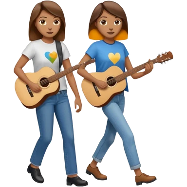based on emoji style, like this "💁🏻♀️" "💁🏽♂️" "💁🏻", two people walking together, one is brown-haired woman, wearing business casual, holding a guitar; another one is a non-binary person, wearing t shirt and jeans, and this person doesn't have anything on their hands. they are walking together. emoji