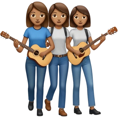 based on emoji style, like this "💁🏻♀️" "💁🏽♂️" "💁🏻", two people walking together. one is brown-haired woman, wearing business casual, holding a guitar. Another one is a non-binary person, wearing t shirt and jeans, and the second person doesn't have anything on their hands. emoji