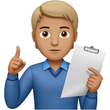 A man stands with a serious face and points his finger at his hand holding papers emoji