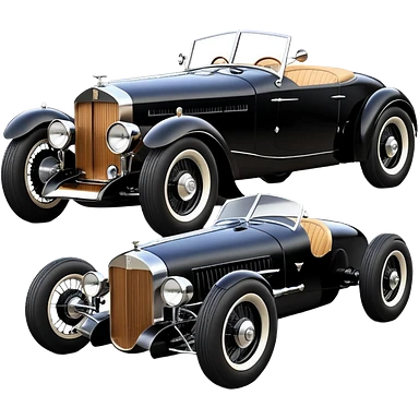 Batgirl’s black Bare bones (channeled cowl) drag racing and speed record modified (fenders removed) chopped streamlined sporty roadster that is a (stripped down) hot street rodded engine sports car 1932 Rolls Royce Woody futuristic wide racing wheels emoji