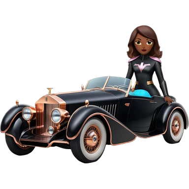 Batgirl’s black Bare bones chopped streamlined sporty (stripped down) hot street rodded engine copper sports car 1932 Rolls Royce Woody futuristic electric spaceship plasma neon glowing motors and lightening dynamos with wide racing wheels that are held strong by advanced suspension and steering emoji