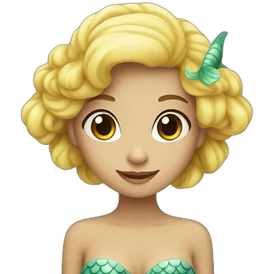 portrait of a mermaid with long flowing sea-green hair, shimmering blue-scaled tail, shell bra, holding a pearl in one hand, smiling softly, front-facing, surrounded by glowing sea particles, fantasy style emoji