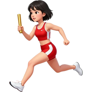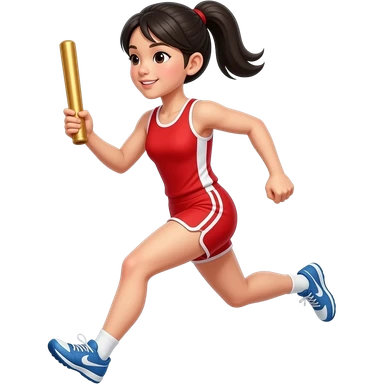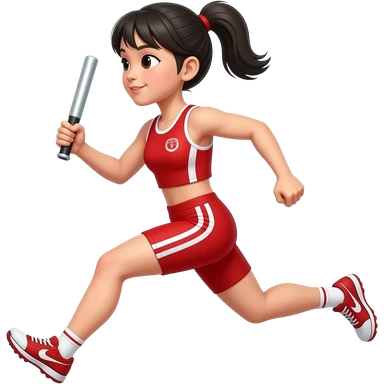 An Asian girl wearing a red track and field uniform with a baton in her left hand and is running fast with a ponytail emoji